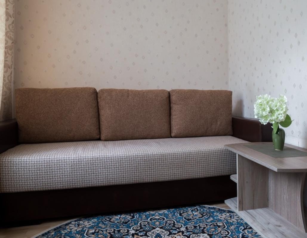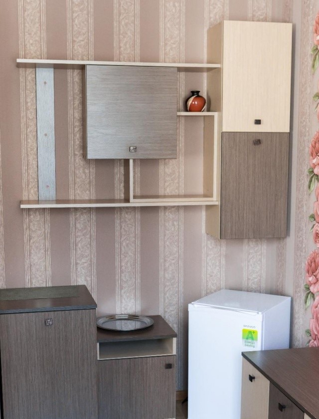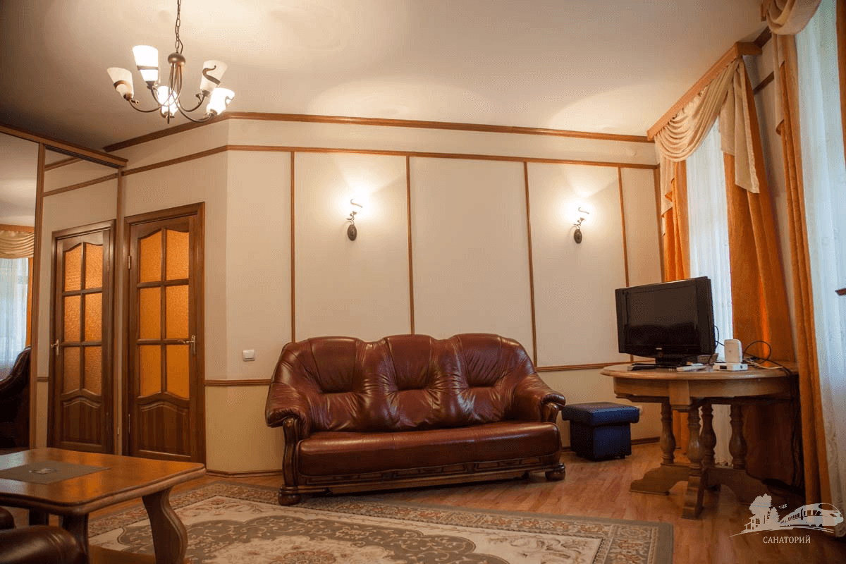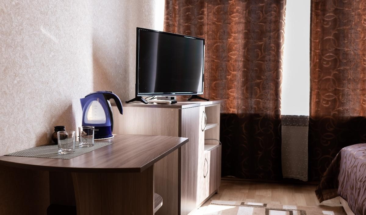 В номере: полутораспальная кровать, прикроватные тумбы, стол, стул, диван, шкаф, холодильник, электрочайник, микроволновая печь, телевизор, телефон