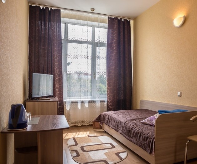 В номере: односпальная кровать, прикроватная тумба, стол, стул, шкаф, тумба под телевизор, холодильник. телевизор, телефон