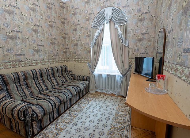 В номере: две односпальные или большая двуспальная кровать, телевизор, кабельное ТВ, холодильник, фен, кондиционер, туалетный столик, тумбы, шкаф для одежды, сушилка для белья, набор посуды, чайник, чайный набор, Wi-Fi в общественных зонах