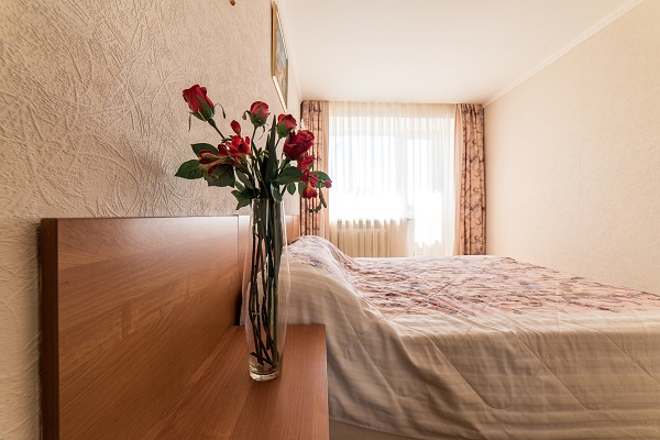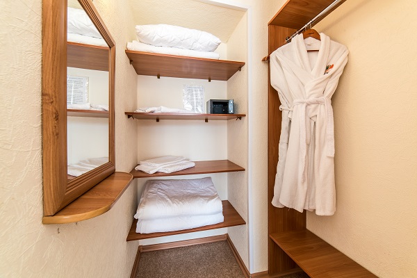 В номере: две или три односпальные кровати, прикроватные тумбы, шкаф, журнальный столик, телевизор, холодильник, чайный набор посуды, электрочайник