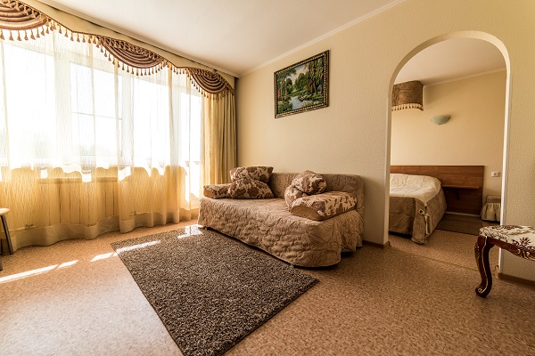 В номере: две комнаты: спальня и гостиная, двуспальная кровать, прикроватные тумбы, шкаф, журнальный столик, раскладной диван, телевизор, холодильник, чайный набор посуды, электрочайник, DVD, сейф