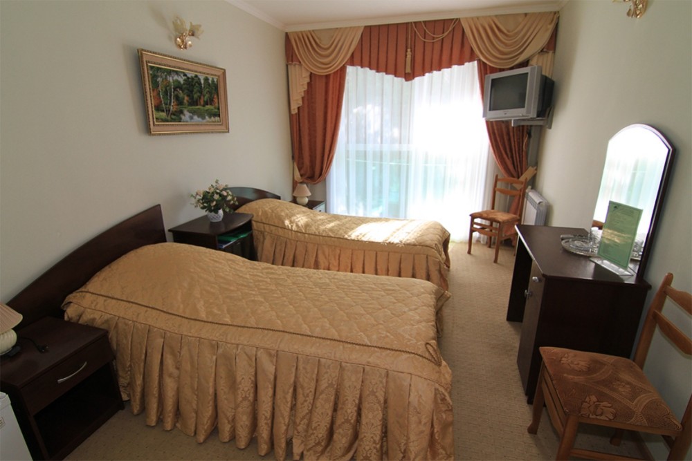В номере: две полутораспальные кровати, прикроватные тумбы, стол, стулья шкаф, мини-холодильник, телевизор