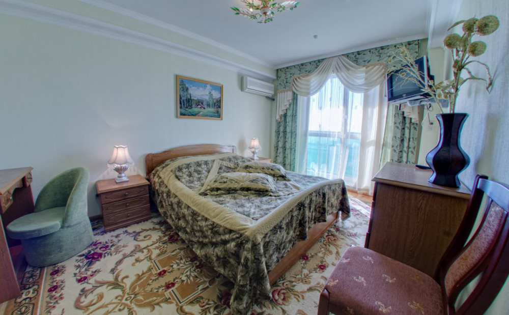 В номере: двуспальная кровать, прикроватные тумбы, стол, стулья, шкаф, холодильник, телевизор, набор посуды