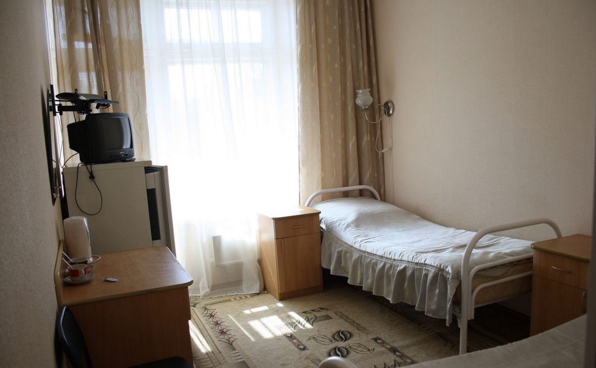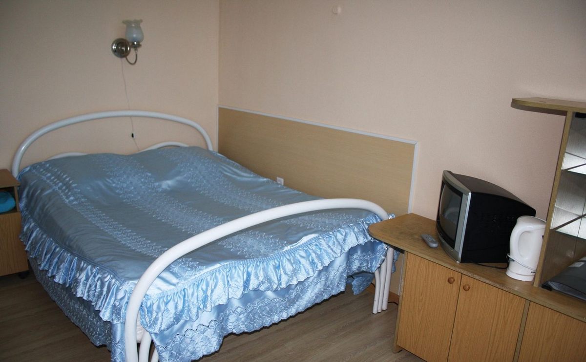 В номере: кровать,телевизор, чайник, холодильник.